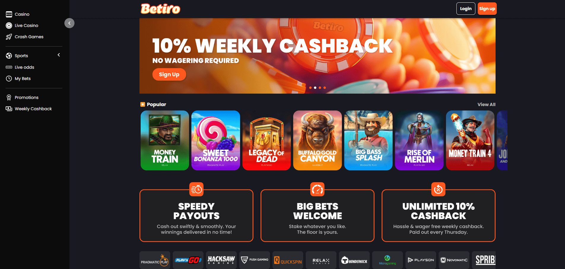 Betiro Casino se remarcă prin selecția de peste 8500 de sloturi, bonusurile atractive ca 10% Cashback săptămânal și opțiunile variate de plată. Cu peste 8.500 de jocuri, inclusiv sloturi, jocuri de masă, crash games și cazinou live, platforma reușește să ofere divertisment pentru toate preferințele. Un alt punct forte este acceptarea plăților în criptomonede, ceea ce permite tranzacții rapide și sigure. Bonusurile sunt generoase.